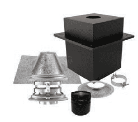 Kit includes: Vertical Cap, Storm Collar, Cathedral Ceiling Support Box with trim and clamp, Adjustable Flashing, and Appliance Adapter. Pipe lengths not included. 4” Kit includes a 3”-4” Appliance Adapter/Increaser, painted black.